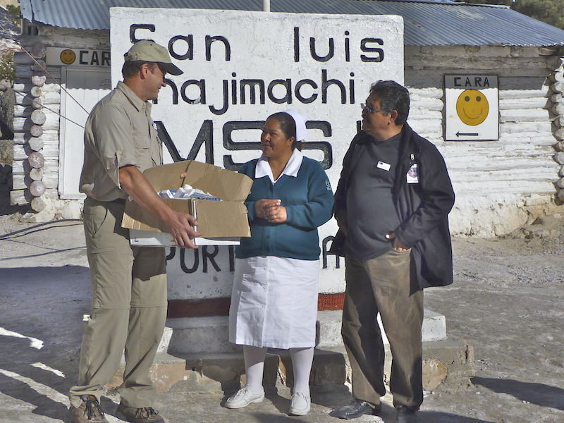 Caption: The program physician, Wade, hands over the donated medical supplies to the nurse who runs the clinic.