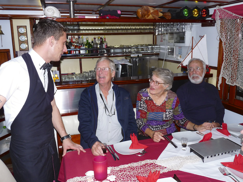 Caption: Mario, Jim, Kathy, and Nelson at our last dinner on board.